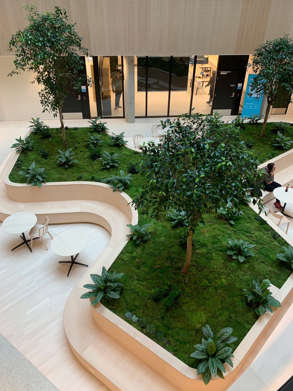 Metropolis har vært involvert i prosjektet fra start til slutt – fra konkurransen om byggeprosjektet i 2017 til ferdigstillelse av møbelprosjektet og studiestart i august 2020. Sammen med L2 Arkitekter AS, engasjert av Kruse Smith Entreprenør AS, vant vi konkurransen med konseptet Edens hage. Bygget er preget av en sterk kontrast mellom innside og utside. Fasaden har et stramt, moderne uttrykk med rette linjer og metallkledning, mens interiøret åpner seg i myke, organiske former av lyst treverk. Hjertet av bygget er et lyst og innbydende atrium, hvor en frodig grønn oase med flere «kunnskapstrær» skaper en inspirerende atmosfære.