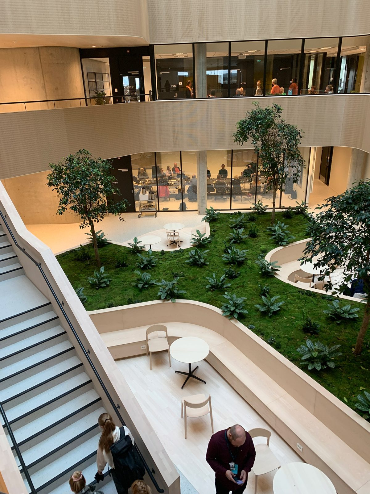 Edens Hage legger til rette for både selvstudium og gruppearbeid. Halvåpne, spesialdesignede grupperom og høye bord langs rekkverket gir innsyn til undervisningsrom, lærernes arbeidsområder og dynamikken i atriumstrappene. Den åpne utformingen reflekterer skolens verdier, og både studenter og ansatte viser stor begeistring for bygget.
